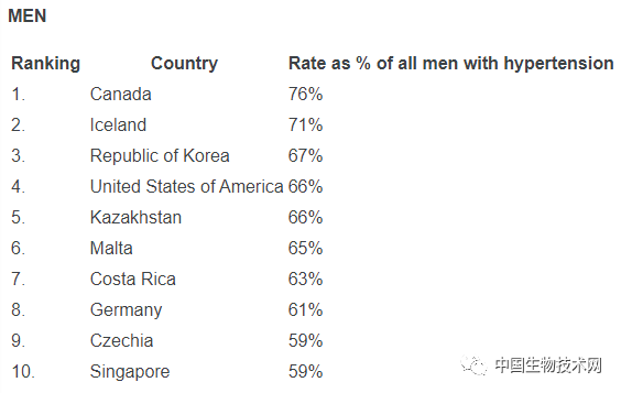 2019年全球男性高血压治疗率最高的国家依次为:加拿大、冰岛、韩国、美国、哈萨克斯坦、马耳他、哥斯达黎加、德国、捷克和新加坡。
