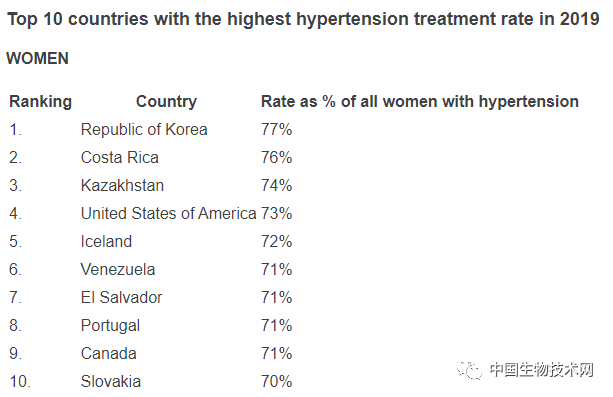 2019年全球女性高血压治疗率最高的国家依次为:韩国、哥斯达黎加、哈萨克斯坦、美国、冰岛、委内瑞拉、萨尔瓦多、葡萄牙、加拿大和斯洛伐克。