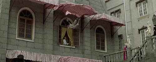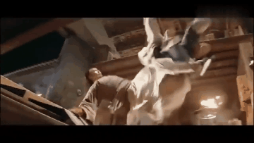 《省港旗兵》里,“洪家班”的元武被要求从商场四五层高的楼上,摔到下面的溜冰场。硬邦邦的冰面,没有任何缓冲物,更惨绝的是,必须腰先坠地。