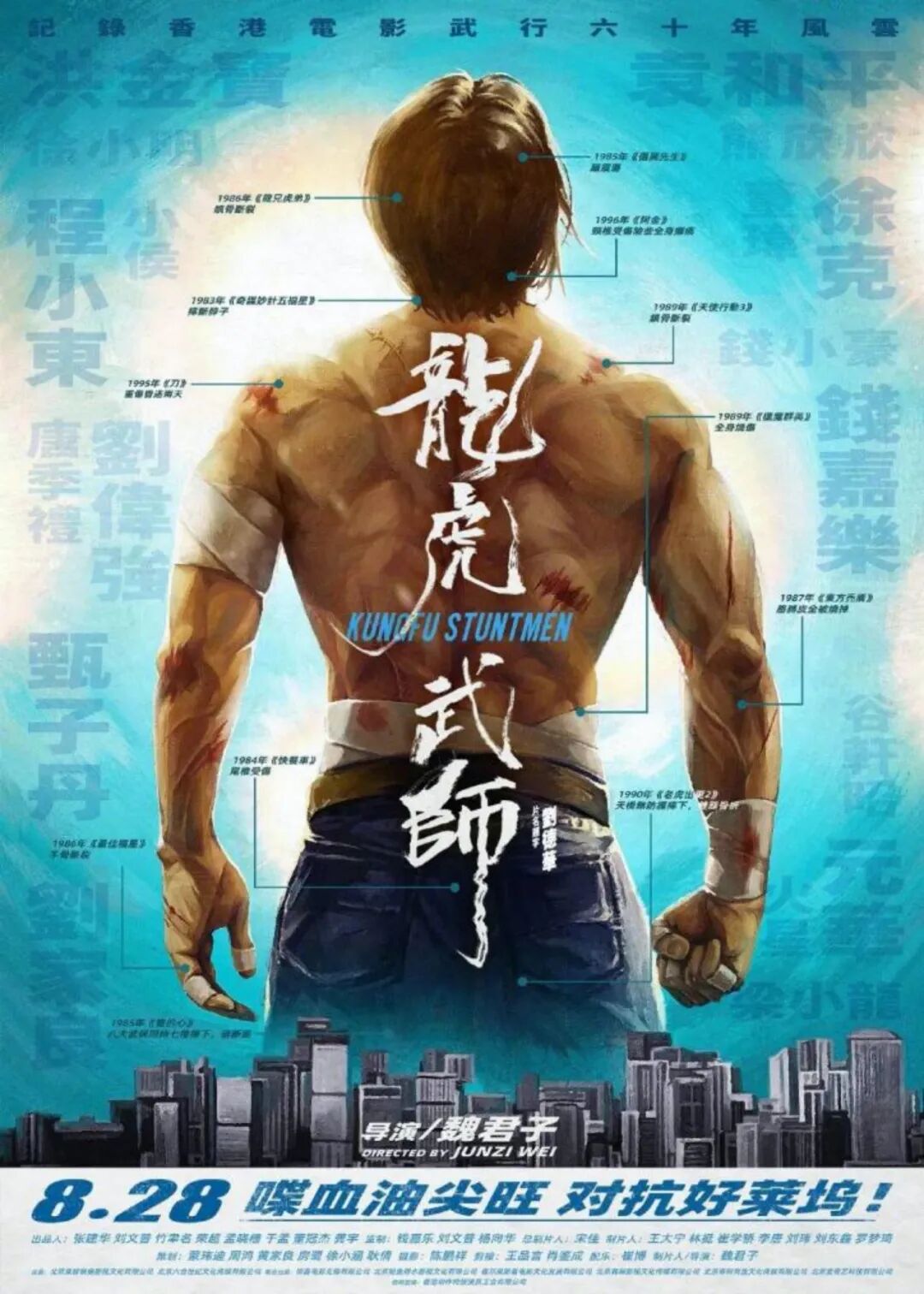 《龙虎武师》有一张海报。那是一个人的背影,上面如针灸穴位图一样,标示着一身伤病。