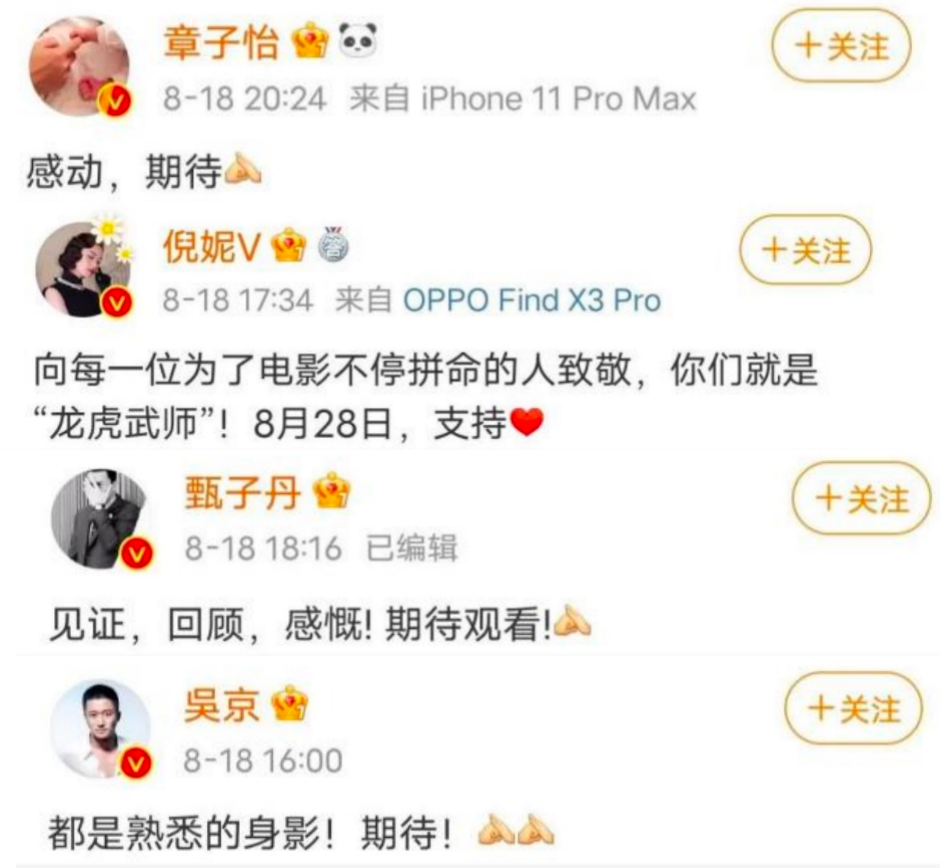 章子怡、吴京、甄子丹、黄晓明、倪妮、李晨、李治廷等明星,纷纷转发预告片,为电影打call。