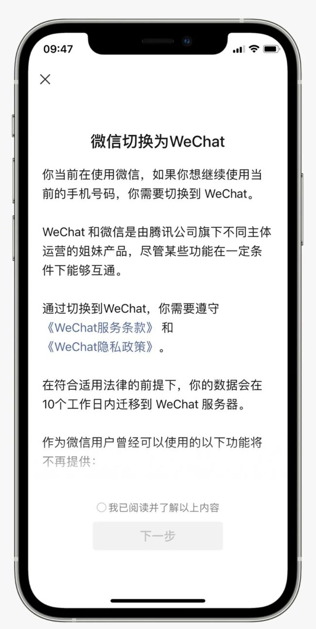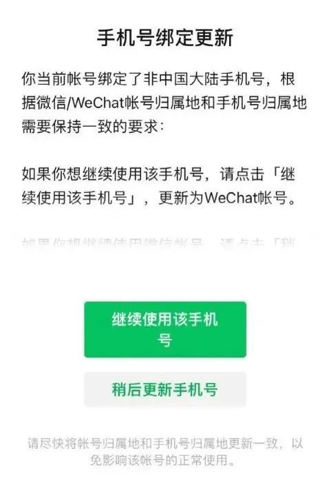那么这近1G的文件到底更新了啥?有细心的网友终于发现了新变化,如果微信绑定的是非中国大陆的手机号,那么就会收到微信发出的“换绑手机号”或“迁移到WeChat”的要求。