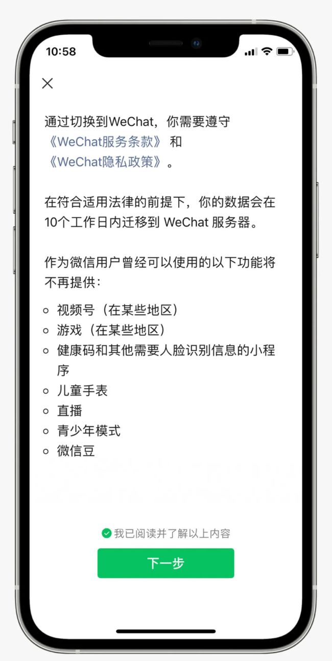 经过一系列操作之后,用户数据就会在10个工作日内迁移至WeChat服务器内,根据地区不同,部分功能可能会被禁用或开启。如视频号、游戏、健康码、直播等。