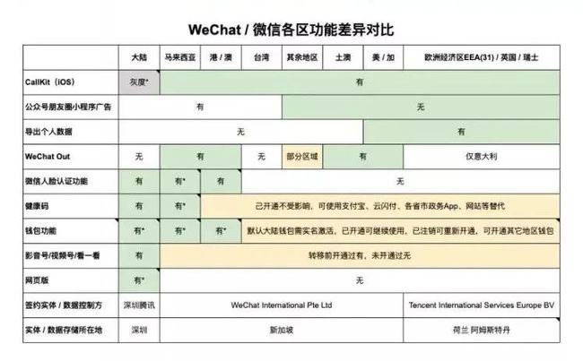 还有一些功能,如果在转移之前开通了,那么转移之后依旧可以继续使用,如视频号、看一看等。需要注意的是,微信还有一个特权,那就是可以使用网页版微信,而其他地区的WeChat都无法登录。微信和WeChat具体还有什么差异,大家可以通过下图进行了解哦!
