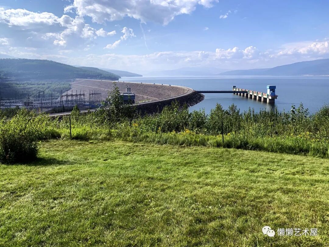蓝天白云,青山碧水,绿草茵茵,反映了世界的自然之美,而大坝的弧形设计清晰地反映了结构力学的人工之美。自然与人力,于此统一,和谐且完美。