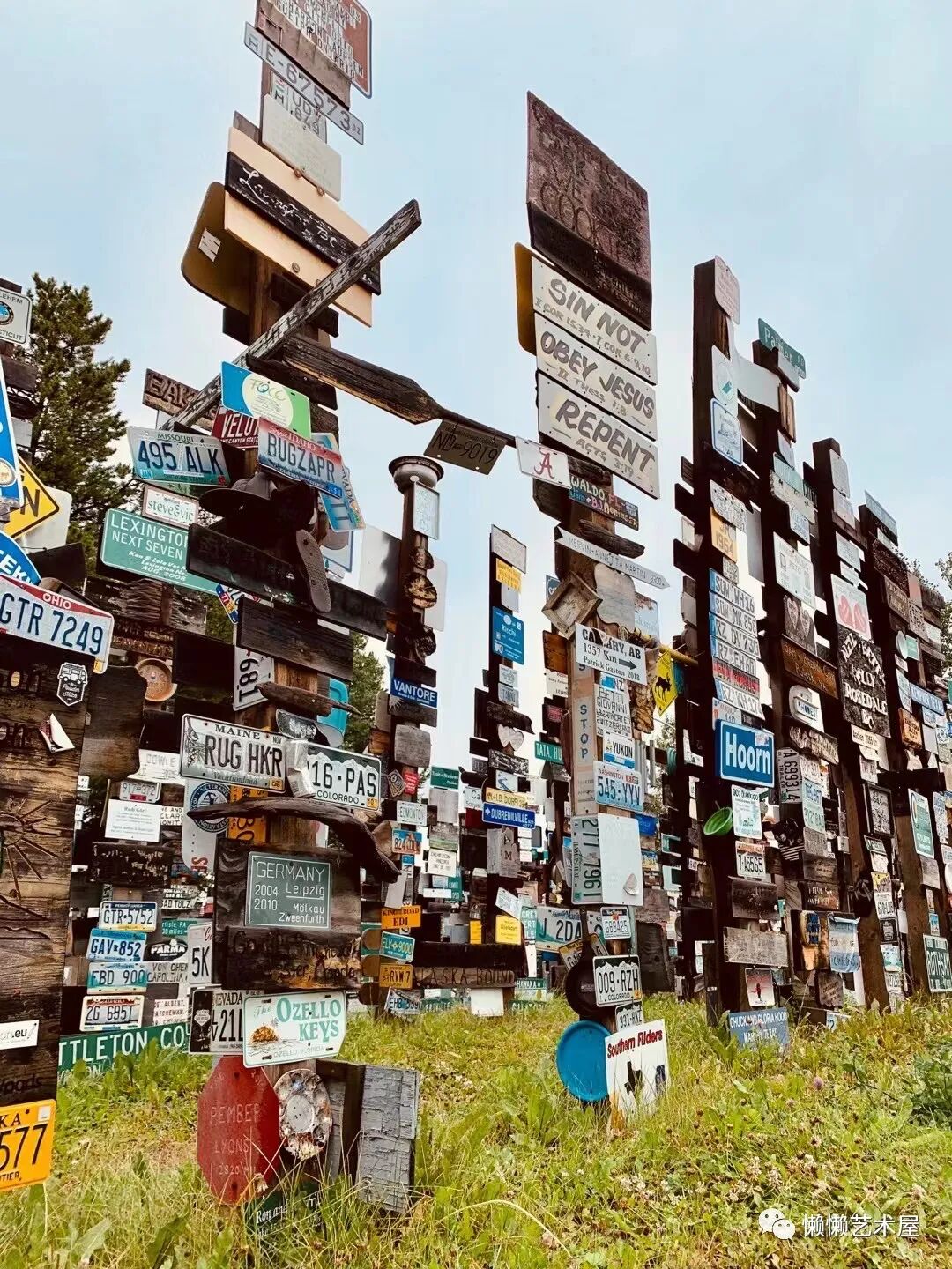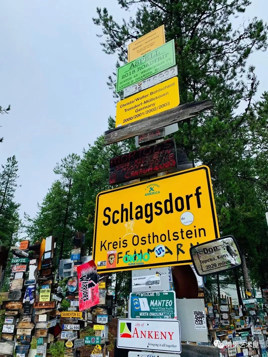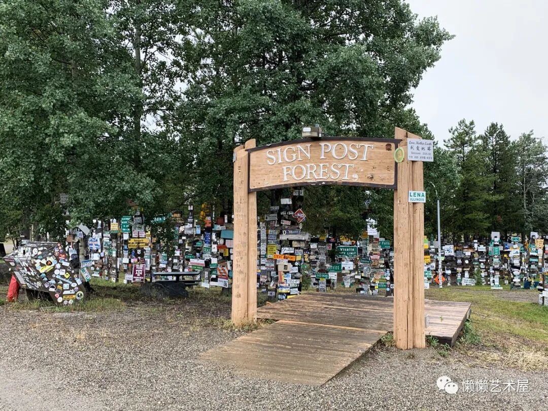 “路牌森林”于1942年由一位在阿拉斯加公路上工作的美国陆军二等兵卡尔·K·林德利创建。因为思念家乡,他在路标上贴了一块写有家乡名称和距离的标牌。其他人开始效仿,这一传统一直延续到今天。截至2010年8月,这里有来自全世界的76000多个不同类型的路牌。