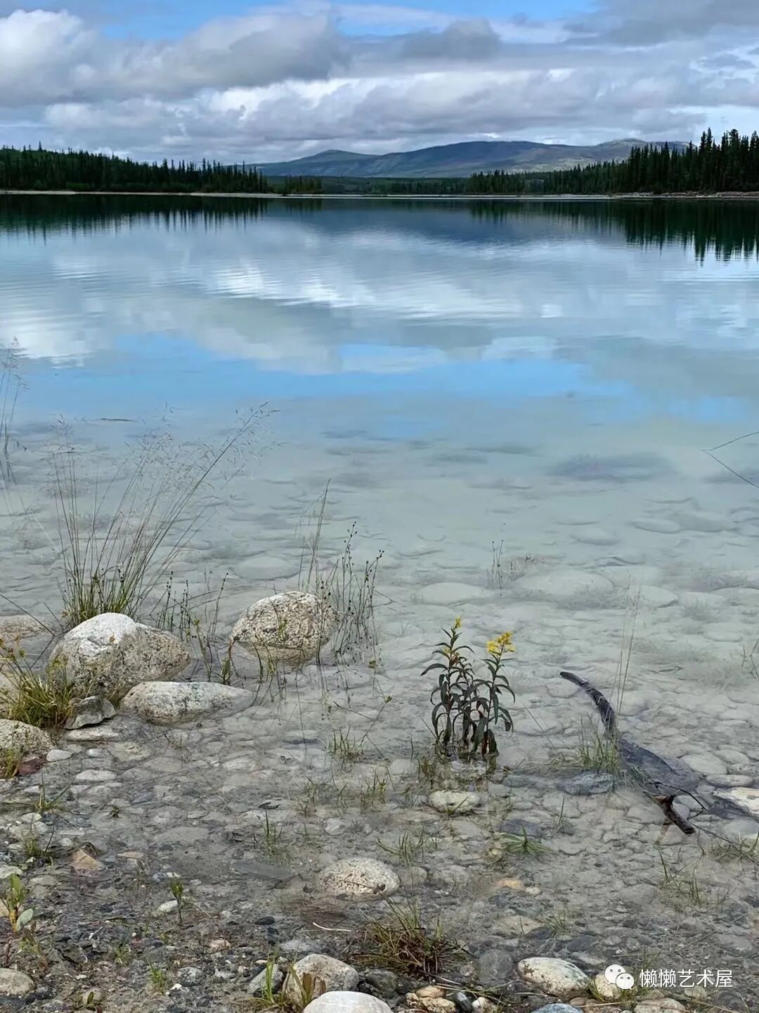 水面平静,水下的石头清晰可见。