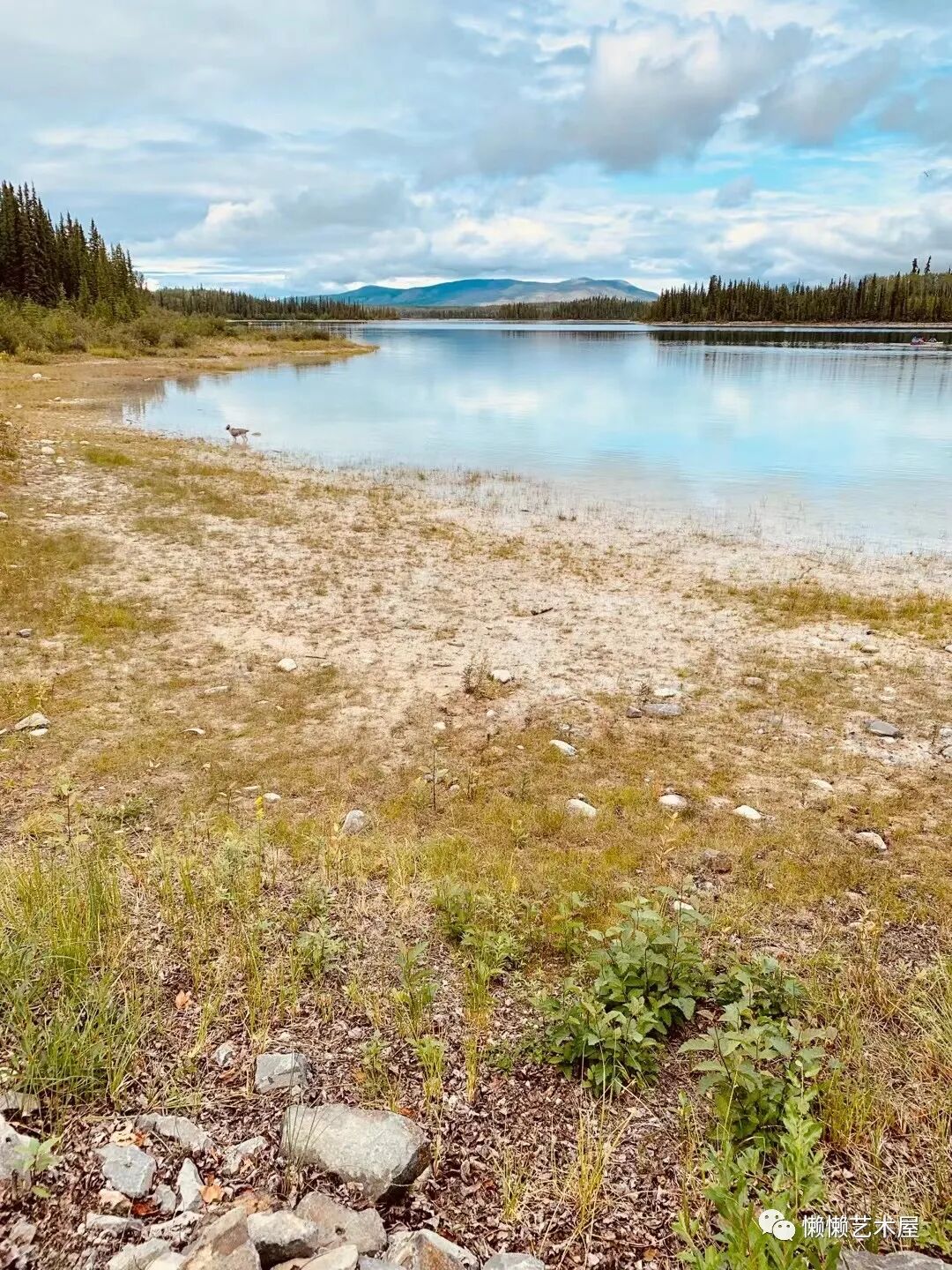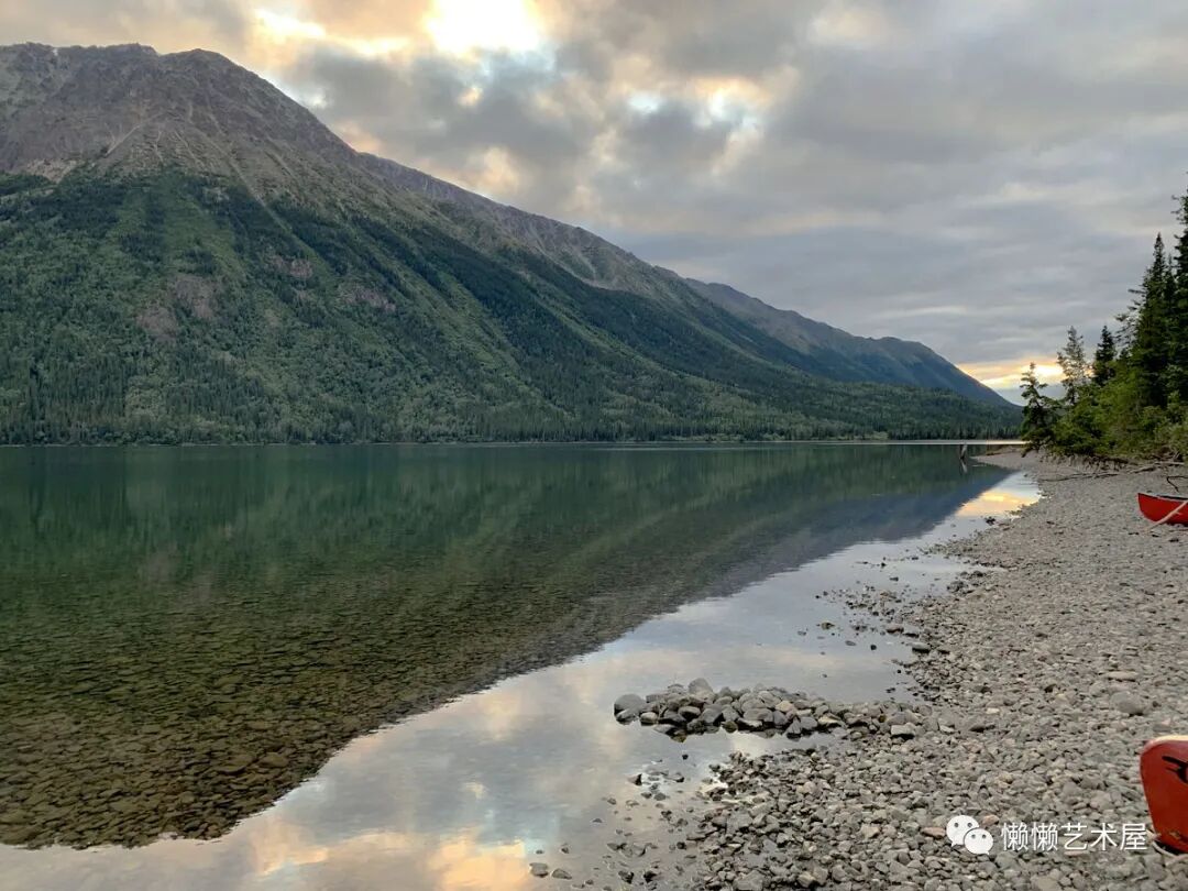 湖边有只可爱的狗狗,似乎很孤独的样子。其实,它的主人就在旁边的林子里,一边看着平静的水面和远处的山岭,一边坐着享受美好的食物。旁边不远处的懒懒屋主看着他们,他们也成了一道风景。