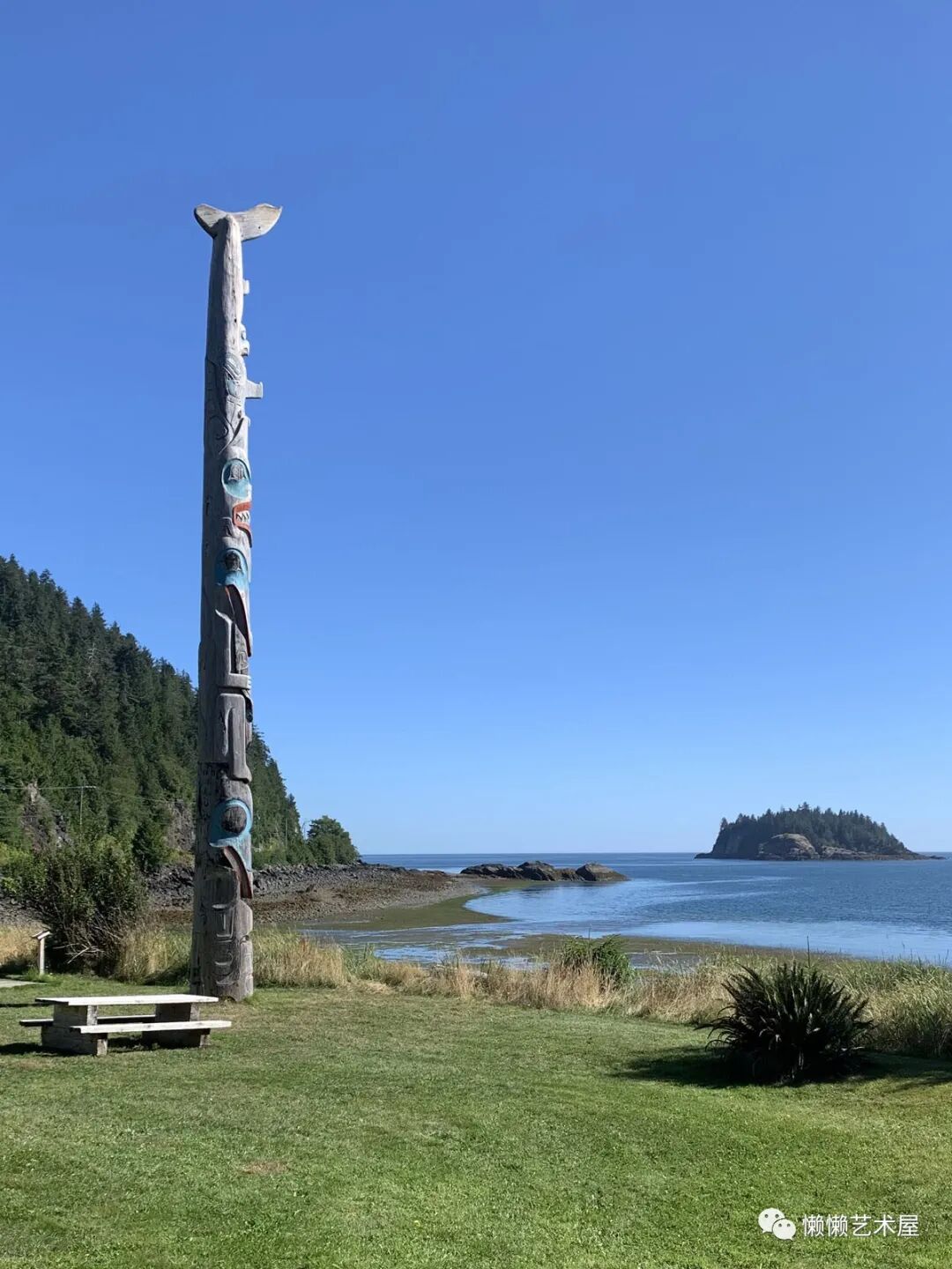该图腾柱非常高大,竖立起来难度比较大,据说错位了一个角度,却冥冥之中指向了海湾对面的原住民部落。因此,图腾柱和部落之间产生了精神的联系。