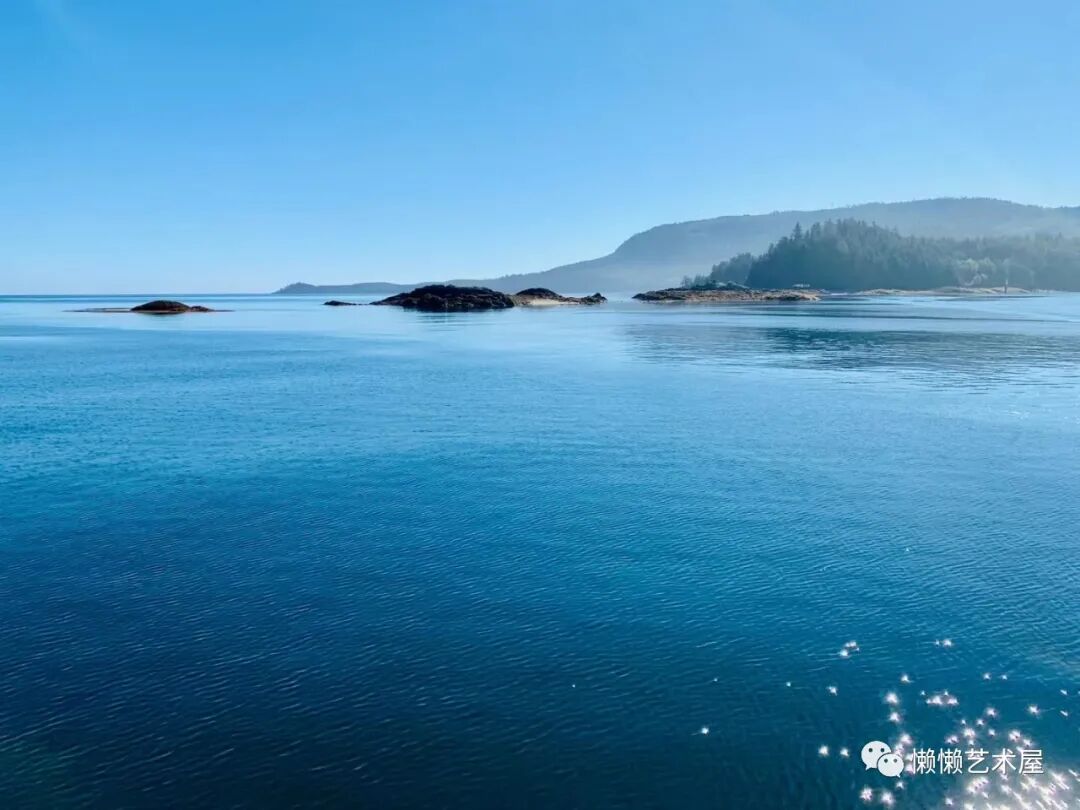 渡轮行驶在海上,尾部掀起的浪花在阳光照耀下闪烁着粼粼的波光。远处的岛屿虚化成一片浅浅的黛青色,而近处的岛礁展现出浓郁而立体的深绿色。