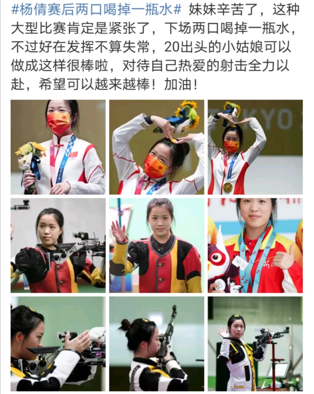 像是这一次的全运会,杨倩比完以后,两口喝掉了一整瓶水。
