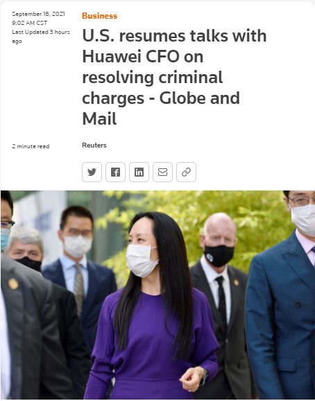 [加拿大乐活网讯lahoo.ca] 据《环球邮报》(Global and Mail)9月17日报道,美国已恢复与华为技术有限公司以及孟晚舟律师的谈判,寻求与孟晚舟达成暂缓起诉协议的可能。这项协议如果达到,将允许华为首席财务官孟晚舟返回中国。