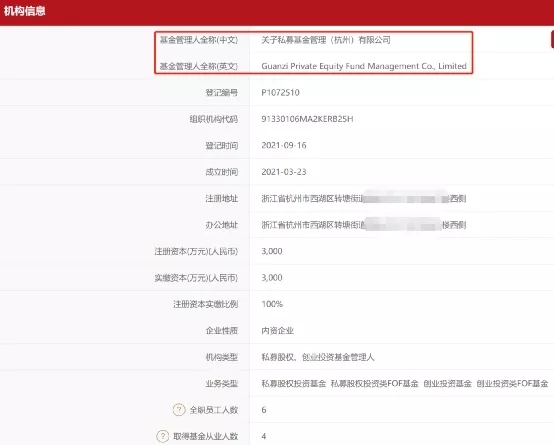 据中国基金报报道,今年9月16日,“关子私募基金管理(杭州)有限公司”在中国证券投资基金业协会完成备案登记,机构类型是私募股权、创业投资基金管理人,目前公司有全职员工6人,取得基金从业资格的有4人。