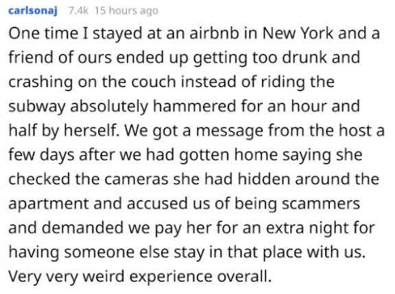 “有一次我在纽约住了一家民宿,我有个朋友那天晚上喝多了没回去,然后直接在沙发上窝了一晚上。我退房了几天之后,民宿的房东突然通知我,说他查看了隐藏摄像记录后,发现我多带了一个人回房,而且还要多收我一晚上的钱!那次经历真的是太诡异了”。