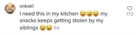“我感觉自己家厨房里就要装一个针孔摄像头,我的兄弟姐妹老是偷我的零食!”