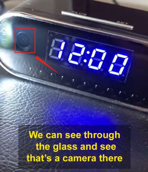 “再比如这种带镜面的闹钟,表面看上去黑乎乎的平平无奇,但只要拿强光一照,我们就能看到镜面后面的摄像头”。