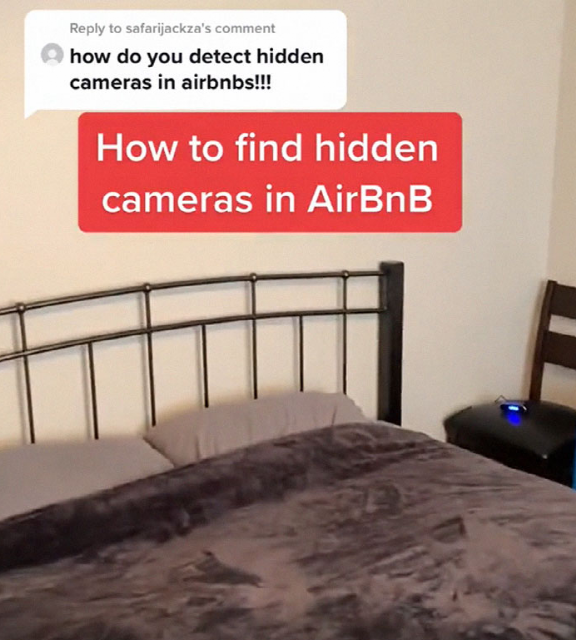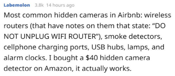 “民宿里大多数的针孔摄像头都会藏在路由器里。这就是为什么上面经常会贴一个‘不要拔插头’的标签。其他常见针孔摄像头的还有烟雾报警器、手机充电桩、USB接口、台灯还有闹钟。我在Amazon上花40刀买过一个隐藏摄像头检测仪,效果还不错”。