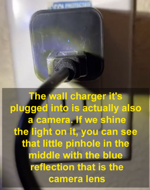 “还有这种插在墙上的充电器,这里面其实也藏了一个摄像头。如果我们用强光照它,就能看到这里面有个反射蓝光的小点,那个就是摄像头的镜片”。