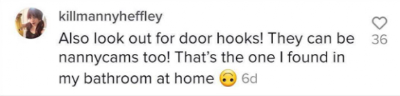 “记得也查看一下门把手!我之前就在自家门把手里面发现过一个针孔摄像头!”