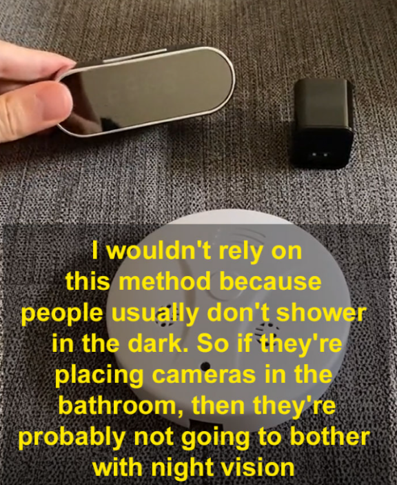 “但这种做法我不太推荐使用,因为装针孔摄像头的人通常会把它们装在浴室这种需要照明才能使用的地方,所以这些针孔摄像头很可能不会具备夜视功能,关了灯拿手机的前置摄像头找的话,可能会找不到”。