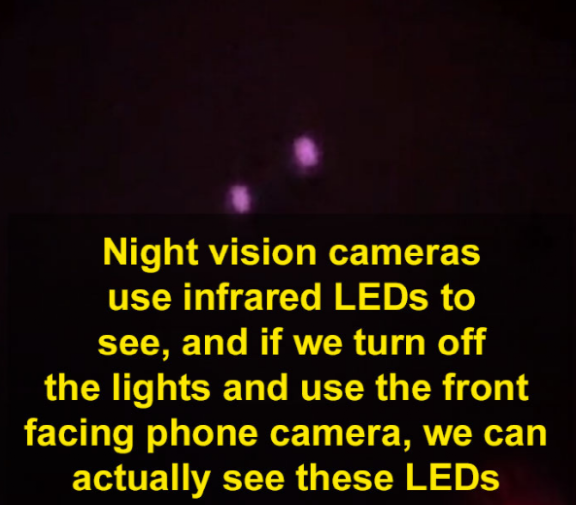 “还有一种夜视摄像头,用的是红外线成像。如果我们把室内的灯都关掉,然后用手机的前置摄像头,就有可能看到针孔摄像头发出的LED光”。