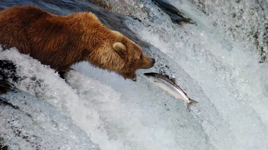 动物们自然也不会错过这场盛宴。在这里,你可以看到秃鹰在头顶盘旋,灰熊在水中捕食,它们都渴望享受一顿从大海涌上河流产卵的三文鱼大餐。