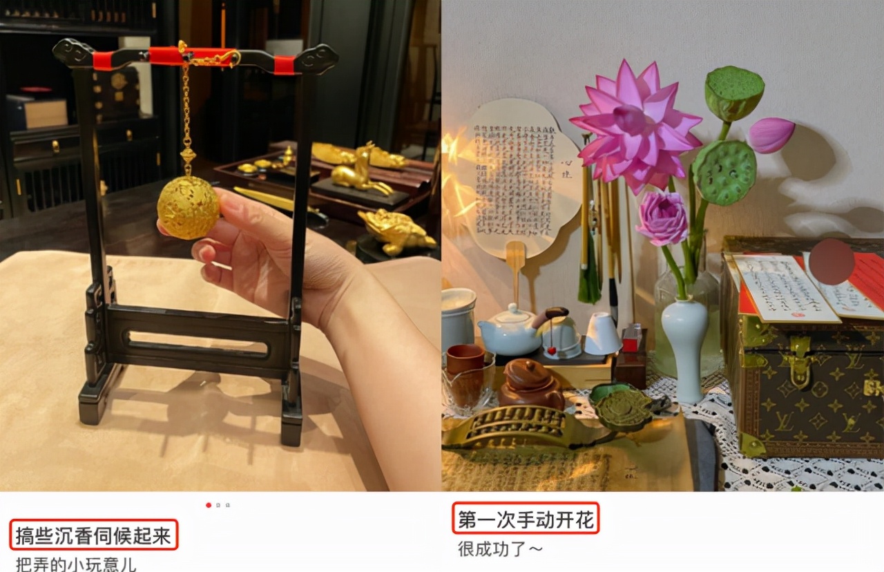 晚上的佛媛们也不闲着,把玩把玩荷花、侍弄侍弄沉香、写写扇面,或者把自己收藏的古董拿出来欣赏欣赏,告诉粉丝这个其实也不是很贵云云。