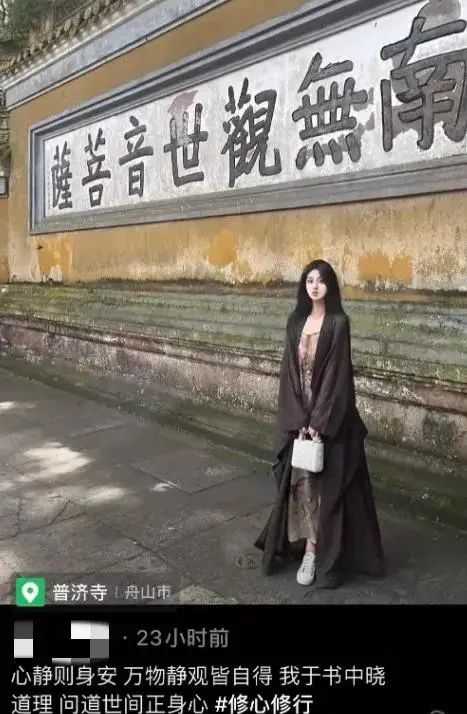 有的佛媛为了强行凹造型,进了寺庙就脱外套,露出里面的高叉旗袍,确保自己前凸后翘后再双手合十。她双手合十也不是正儿八经的,非要搔首弄姿大秀身材曲线;还有的佛媛她不双手合十了,她虔诚地用双手将Dior戴妃包包捧在胸前,稳稳占据C位。