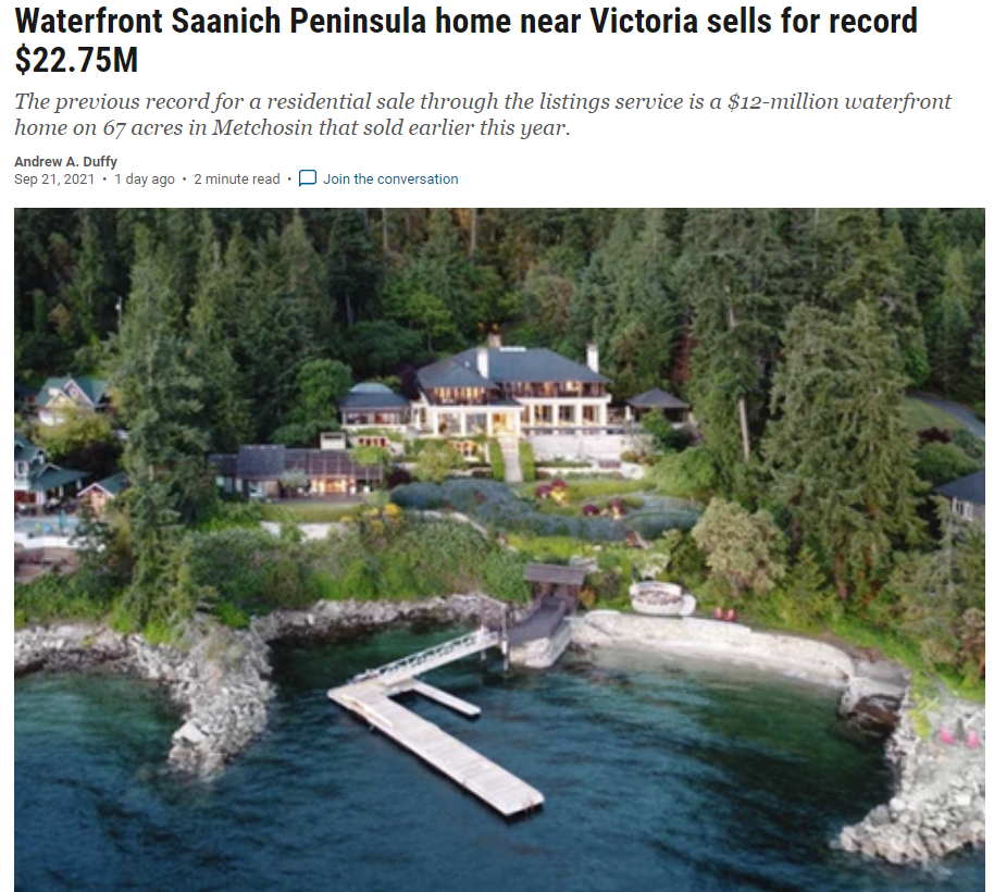 然而,在房价远低于温哥华的温哥华岛,近期却有一套豪宅以创历史记录的2275万加币,约合人民币1亿多元成交!