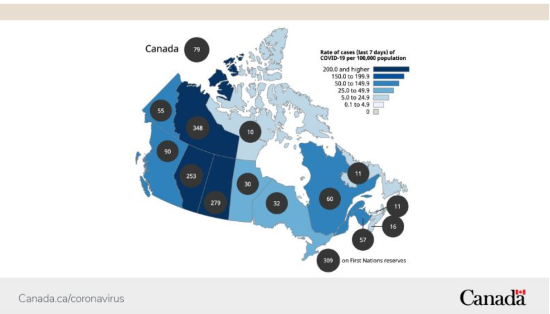 截至24日,加拿大平均每天新增感染病例4300宗;而3周前,这个数字为3500例。