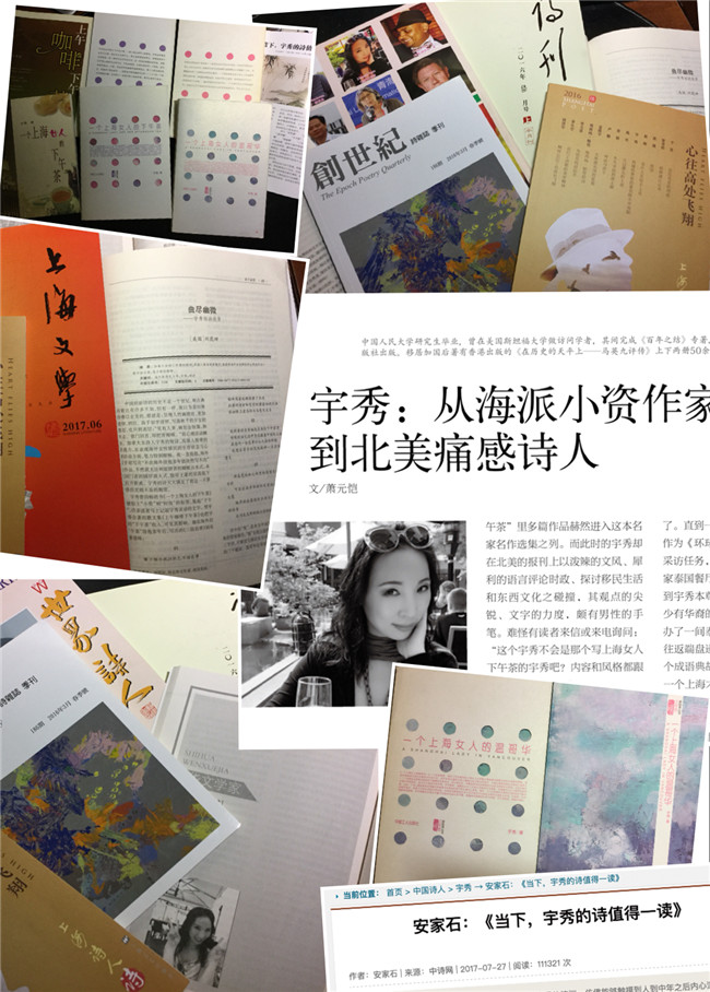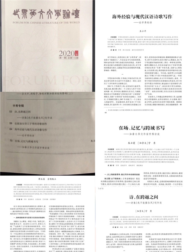 宇秀是近年来在华语诗坛引起相当关注、并拥有广泛读者的域外诗人,她从早年以《一个上海女人的下午茶》、《一个上海女人的温哥华》而拥有广大读者的“海派小资作家”,转型为具有创作力度和悲悯情怀的、将汉地记忆融入北美日常经验的、在远离母语的英文世界的边际化语境中独树一帜的华语诗人。她在2018年秋季先后在中国大陆与台湾出版的两部诗集《我不能握住风》和《忙红忙绿》,被诗歌评论界认为“ 堪称近年海外新移民诗人群标志性的现代诗创作成果,很大程度刷新了新移民作家群的诗歌写作风貌,也为新世纪的华文文学创作提供了一种新的美学可能性。” 她的诗作入选了近年来的多个有影响力的权威诗歌年度选本,同时获得“2018年十佳诗集”奖、“2018年十佳华语诗集”奖、台湾第13届叶红女性诗歌奖、2019年海外华文著述奖、第40届中国时报文学奖新诗首奖、2019年度“十佳华语诗人”称号等。