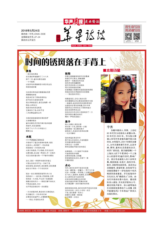 暨南大学文学院教授、博导白杨在发言中指出:“宇秀的诗句有平中出奇的力道,能把看似平凡的物事以触目惊心的方式表达出来。她是不肯同平凡或陈规戒律妥协的人,所以她的文字中有大胆率真的特色,宇秀的文字承载着对当下女性生存姿态的一种思考,也容纳着移民生活背后自我追寻的本真,却不失趣味、雅致,将时光之河的涟漪凝铸成感人的诗句。