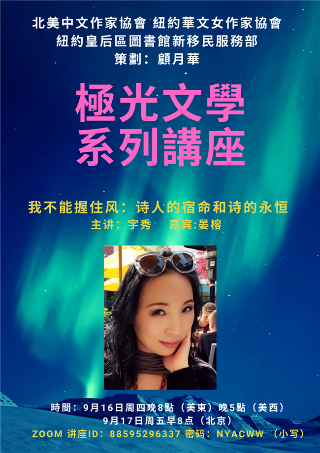 这是于北京时间9月17日早上,美西与美东当地时间16日下午和晚上,由北美中文作家协会、纽约华文女作协、纽约皇后区图书馆联合举办的极光文学系列讲座之第25期。该系列文学讲座由纽约华文女作协荣誉会长、美籍华裔女作家顾月华女士创意策划,囊括了当下华语文坛活跃在海外中文创作和理论场域的诸多作家、评论家、学者,通过网络云会打破了地域疆界,成为疫情期一道跨国界的文学风景线。本期现代诗专题讲座,是该系列第一次,也是唯一一次邀请近年在华语诗坛颇具影响的诗人担任主讲,并同时要邀请了诗人、诗歌理论家、翻译家、杭州师范大学教授、国际诗歌交流与研究中心主任晏榕担任嘉宾,吸引了众多国内研究海外华文文学的专家学者和海内外文学名家与热情的读者上线参与。