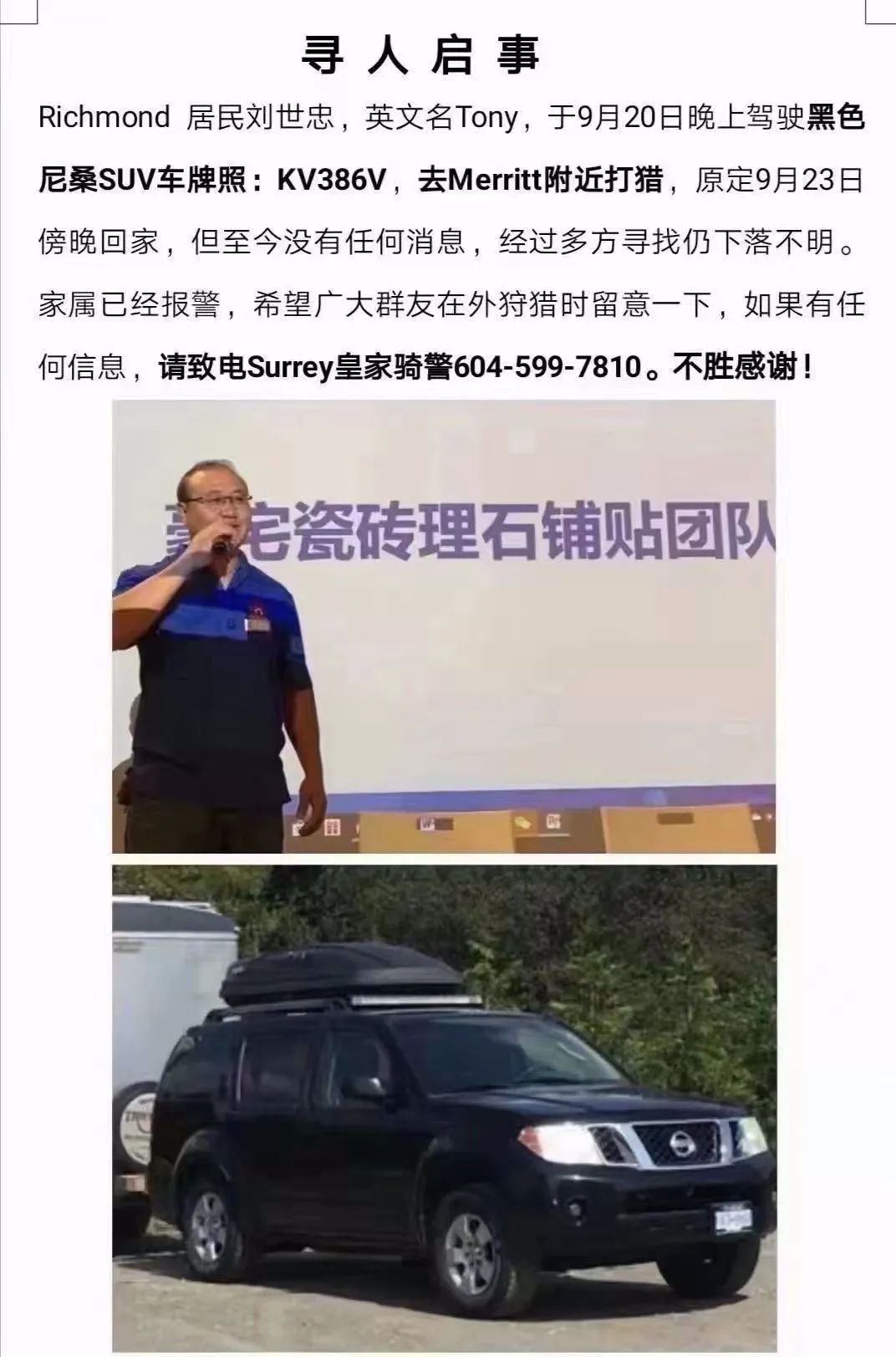 微信、Facebook,各种中英文的转发,都是因为有一名家住Richmond的Tony刘先生,于9月20号凌晨独自离家出发,去Merritt山里猎区打猎后就再未见踪影。