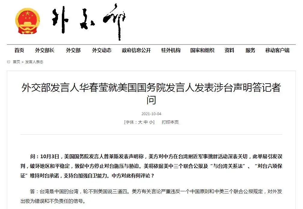 问:10月3日,美国国务院发言人普莱斯发表声明称,美方对中方在台湾附近军事挑衅活动深表关切,此举易引发误判,破坏地区和平稳定,敦促中方停止对台施压与胁迫。美将依据美中三个联合公报及“与台湾关系法”、“对台六项保证”维持对台承诺,支持台加强自卫能力。中方对此有何评论?