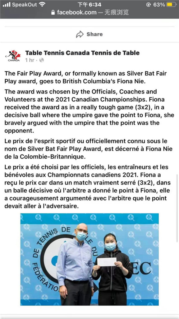 除此之外,Fiona还获得了加拿大乒协组委会颁发的另一个奖项:Fair Play Awards。