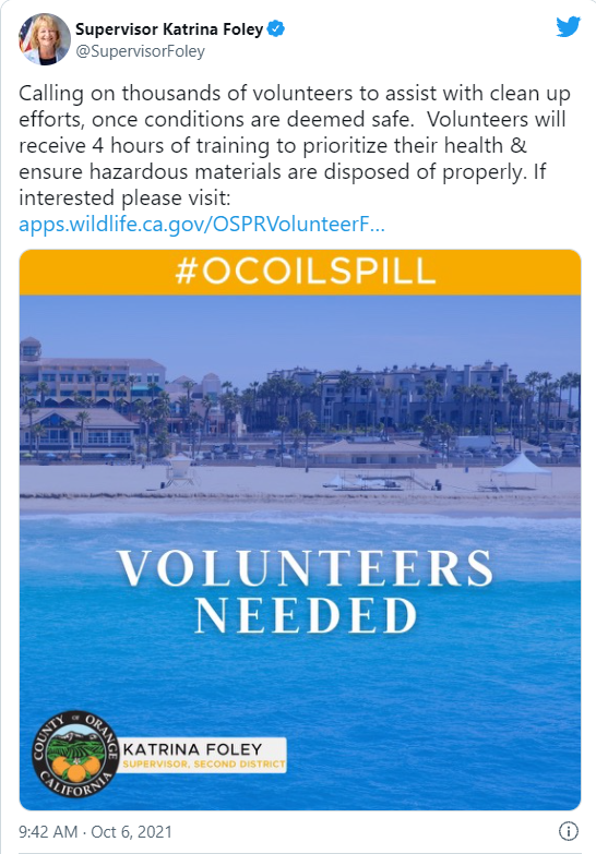据报道,在15.67英里的海岸线上发生了油污。官员们已经清理了6英里的海岸线,但清理工作仍在进行中。已经部署了11360英尺的围栏,328 名人员在现场协助。
