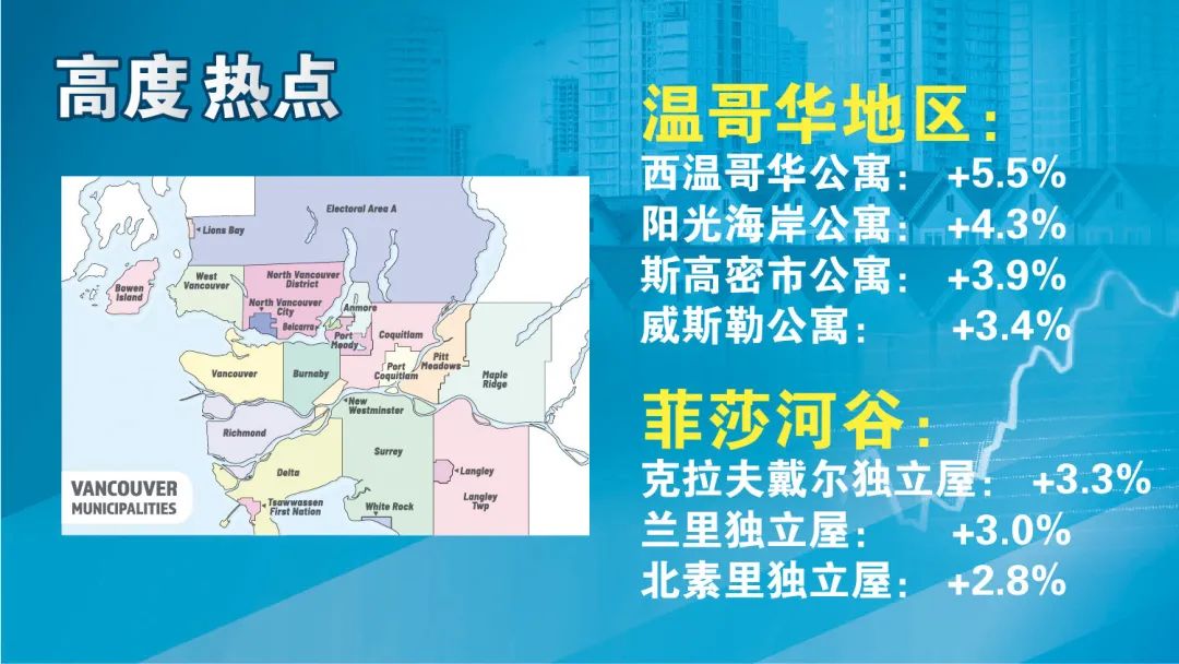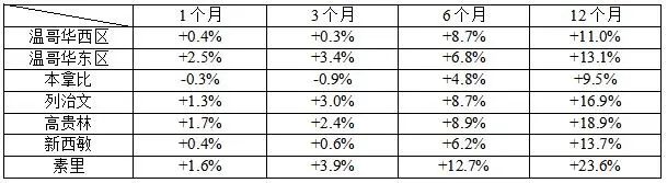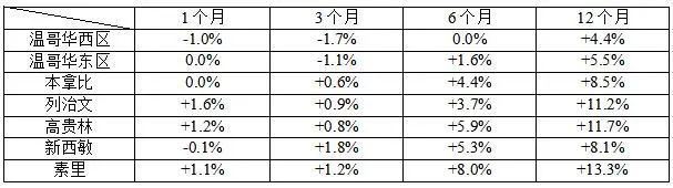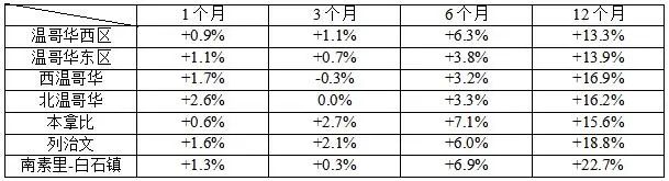 温哥华地区:西温哥华公寓,+5.5%;阳光海岸公寓,+4.3%;斯高密市公寓,+3.9%;威斯勒公寓,3.4%。