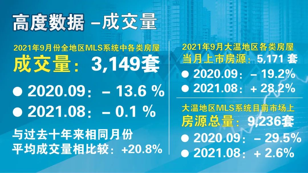 在成交量方面,温哥华地区房地产协会的数据报告显示,2021年9月份全地区MLS系统中各类房屋的交易总量为3,149套,与2020年9月份相比增加了13.6%,与2021年8月份相比减少了0.1%。上个月的总成交量与过去十年来相同月份成交量的平均值相比,超越了20.8%。2021年9月大温地区各类房屋的当月上市房源为5,171套,与2020年9月相比减少了19.2%,比2021年8月份增加了28.2%。大温地区MLS系统目前市场上的房源总量为9,236套,比2020年9月减少了29.5%,与2021年8月份相比增加了2.6%。市场的房源总量与过去十年来相同月份的平均值相比,大幅下降了27.7%。