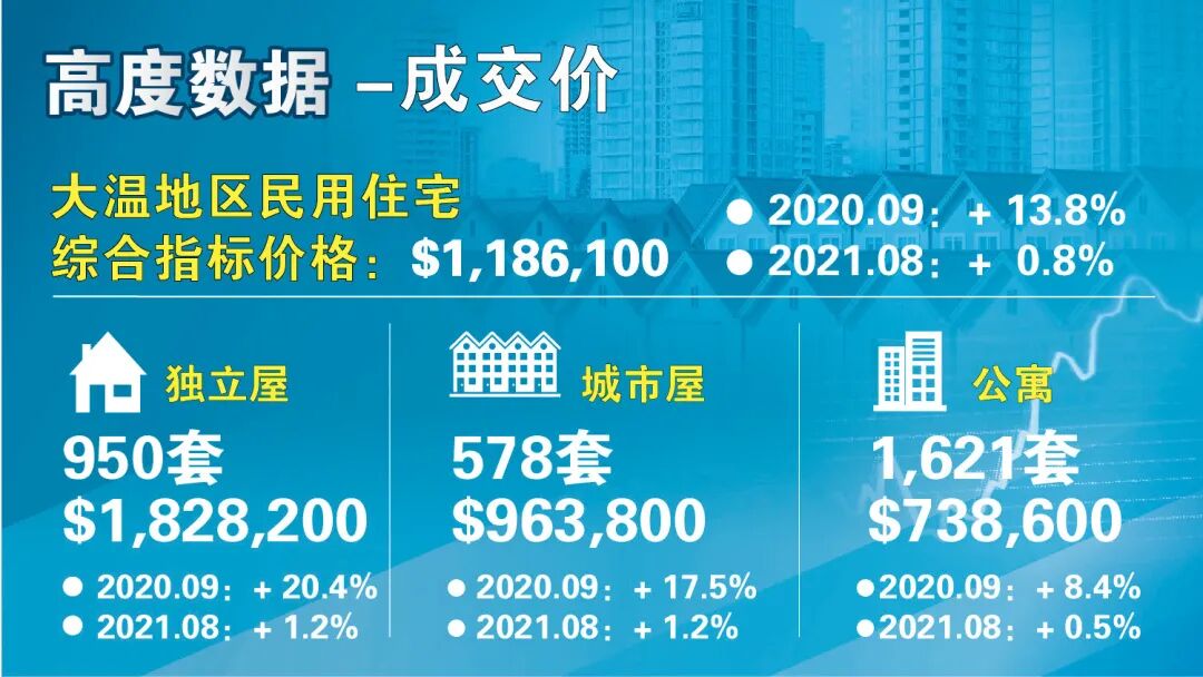 在成交价方面,大温地区民用住宅MLS房屋价格指数的综合指标价格现在是$1,186,100,比去年同期上涨了13.8%,与上个月相比价格上涨了0.8%。在各类房型中,目前全地区独立屋的指标价格为$1,828,200,比去年同期上升了20.4%,过去一个月上涨了1.2%;公寓的指标价格为$738,600,比去年同期上涨了8.4%,过去1个月来价格上涨了0.5%;目前全地区城市屋的指标价格为$963,800,比去年同期上涨了17.5%,比上个月上涨了1.2%。