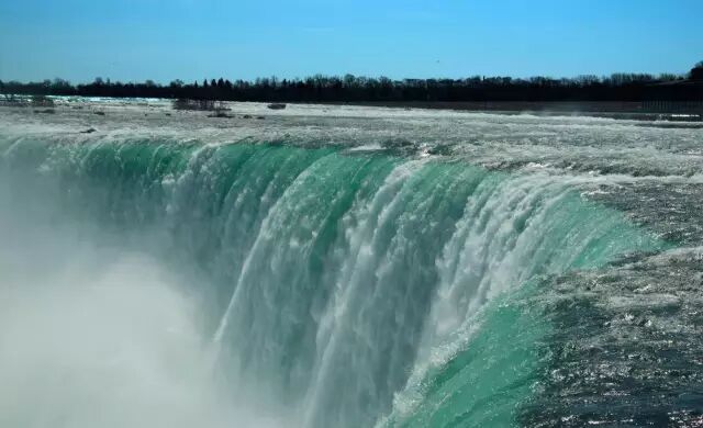 五、尼亚加拉瀑布,尼亚加拉河连接伊利湖和安大略湖, 每秒流量是2407立方米。瀑布并一分为二,形成马蹄瀑布与美国瀑布两个瀑布。其中马蹄瀑布也称加拿大瀑布,橫跨美加两国,占尼亚加拉河約90%的水量,河水呈青色。瀑布呈半环型,宽670米,落差57米。