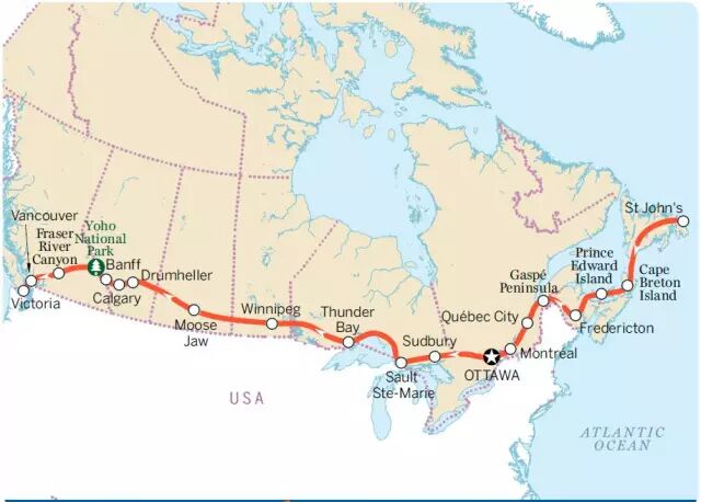 七、横贯加拿大自驾游(driving the trans-canada Highway),从加拿大东海岸纽芬兰省的圣约翰斯(St John’s)到西海岸卑诗省的维多利亚,全长7800公里。途中有加拿大很多迷人的风景,包括班芙国家公园,约虎(Yoho)国家公园,途中还经过魁北克城、蒙特利尔、渥太华、卡尔加里、温哥华。