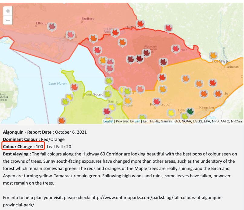 糖枫树(Sugar Maple)是加拿大最美的枫叶品种。阿冈昆公园称,本周预计是本季最佳的糖枫树秋色景观。