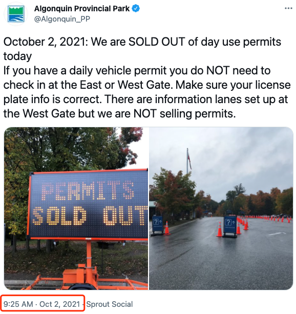 不过,由于大流行,今年和去年一样,阿冈昆公园实施车流限制,例如,上周六10月2日一大早公园就被挤爆了。