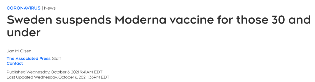 近日,瑞典突然宣布停用莫德纳疫苗,所有30岁及以下的人禁止接种!
