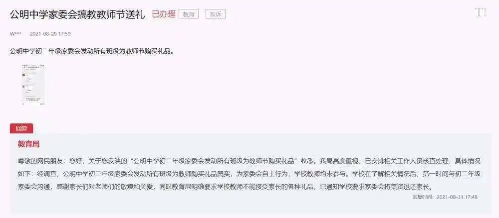 深圳某校初中二年级家委会发动所有班级学生家长为教师送礼,负责人公然催促送礼进度,后被监管部门叫停。