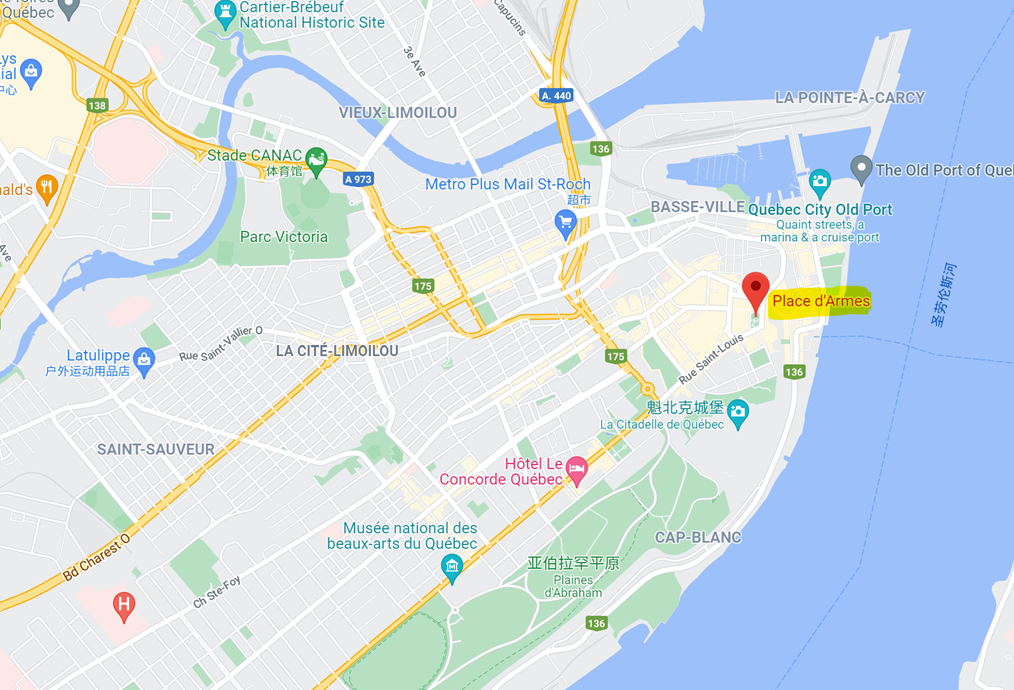 1、在著名历史街区魁北克老城(Old Quebec)中心广场Place d”Armes的下车点等待;