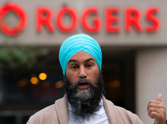 新民主党领袖辛格于 2021 年 9 月 14 日宣布了多伦多市中心的手机价格。(图自:The Canadian Press)
