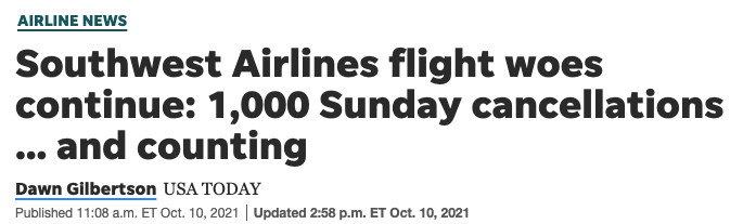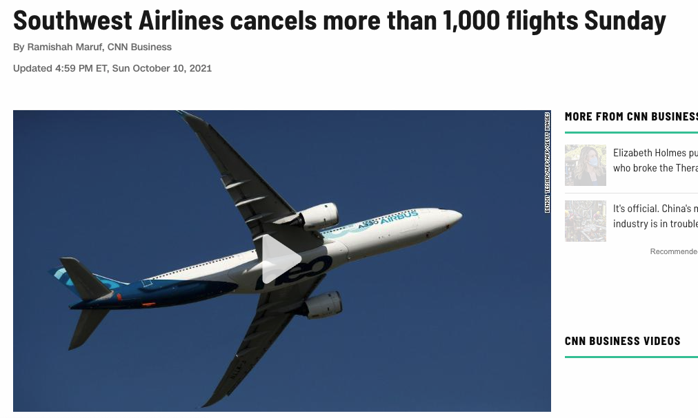 由于航空管制,天气因素,更疑似有上万名飞行员因为疫苗强制令而罢工,因此,10日西南航空在全美范围内取消了1018班次航班。