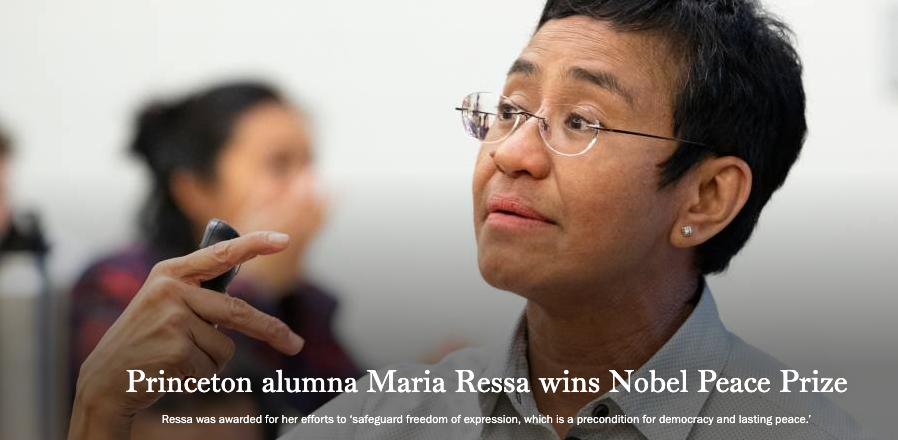 除了这两位普林斯顿大学经济系毕业生之外,今年诺贝尔和平奖获得者玛丽亚·雷沙(Maria Ressa)也是普林斯顿大学的校友。